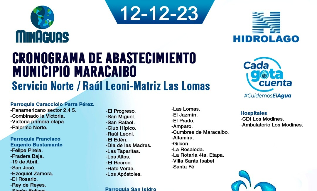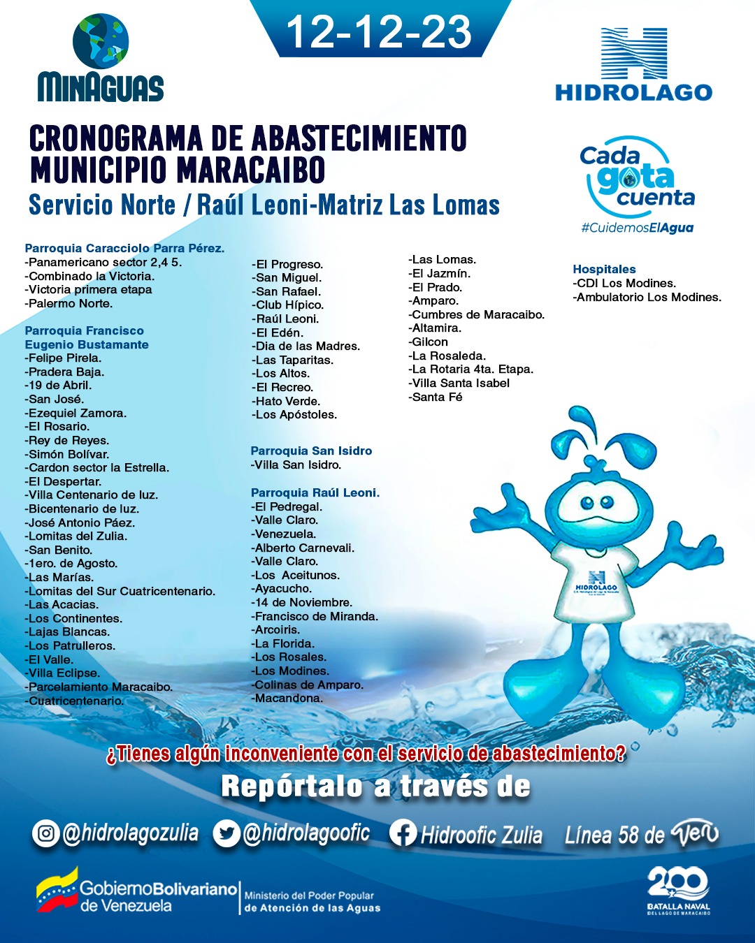 Hidrolago informa a los usuari@s del municipio Maracaibo, que ya se encuentra activo el Servicio Norte Raúl Leoni/ Matriz las Lomas