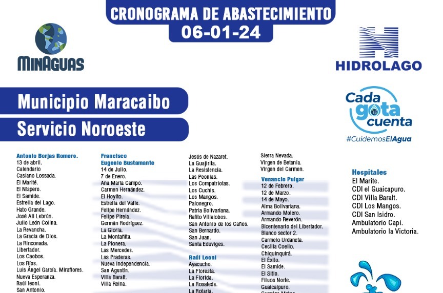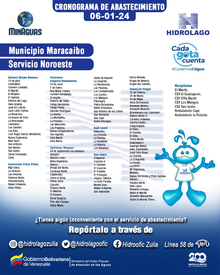 #06Ene Cronograma de Servicio Activo para el Municipio Maracaibo #Zulia Hidrolago informa a los usuarios del municipio Maracaibo que están activos desde el #06Ene el Servicio Noroeste por la matriz de Juana de Avila y Noroeste que surten las comunidades de las parroquias: 💧 Antonio Borgas Romero 💧 Caracciolo Parra Pérez 💧 Coquivacoa 💧 Francisco Eugenio Bustamante 💧 Idelfonso Vásquez 💧 Juana de Ávila 💧 Olegario Villalobos 💧 Raúl Leoni 💧 San Isidro 💧 Venancio Pulgar Y los centros de Salud de las diversas zonas mencionadas.
