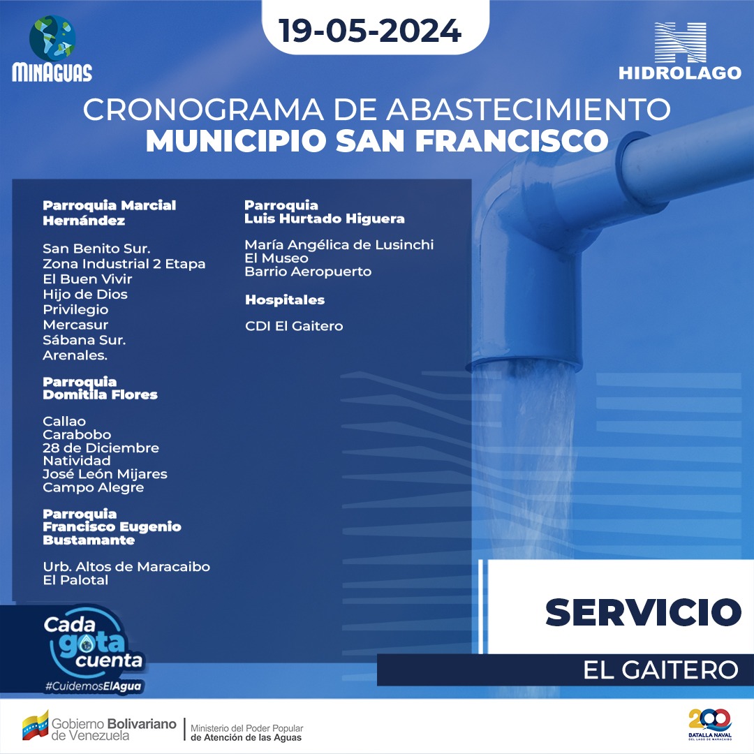 Hidrolago informa a los usuari@s de los municipios Maracaibo y San Francisco, que ya se encuentran activos los Servicios Santa María, y El Gaitero