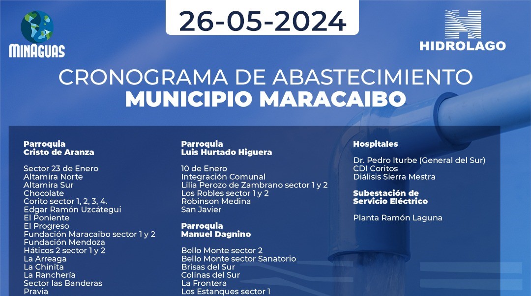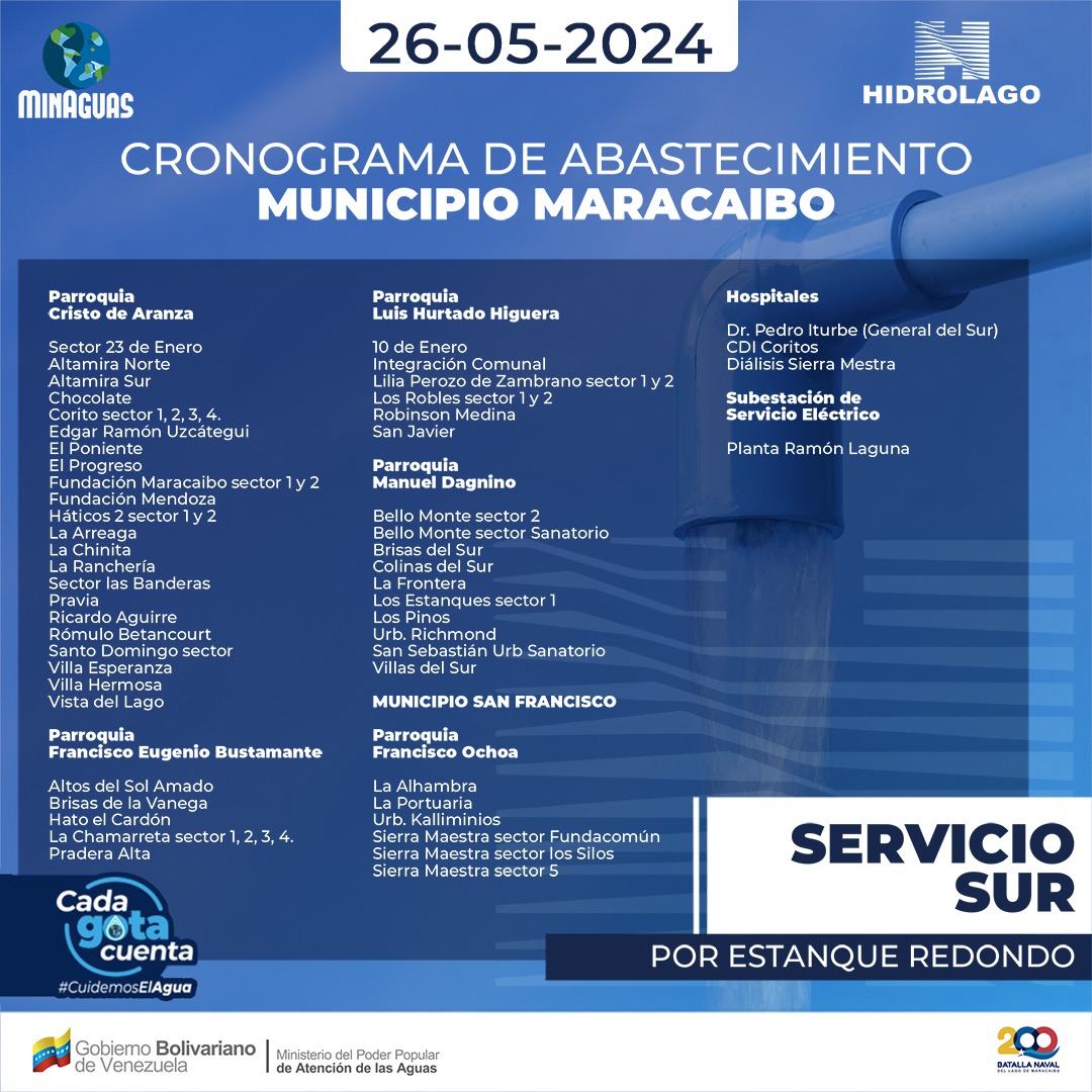 Hidrolago informa a los usuari@s del municipio Maracaibo, que ya se encuentra activo el Servicio Sur desde Estanque Redondo