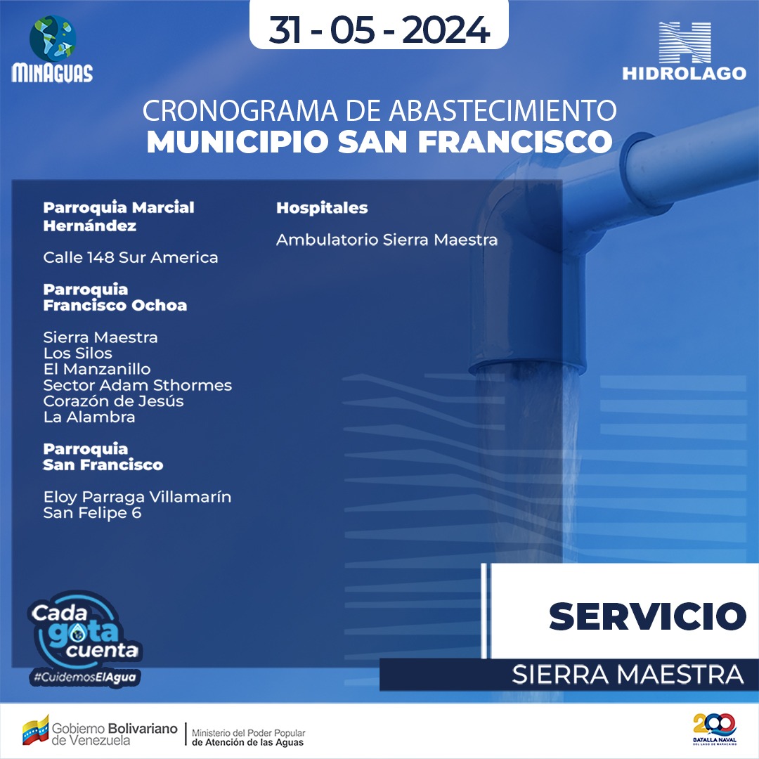 Hidrolago informa a los usuari@s del municipio San Francisco, que se encuentra activo el Servicio Sierra Maestra Navegación de entradas Hidrolago sustituyó 35 metros de tuberías de 16 pulgadas en municipio Mara 01 Jun | Cronograma de abastecimiento municipio Maracaibo #ServicioNorte