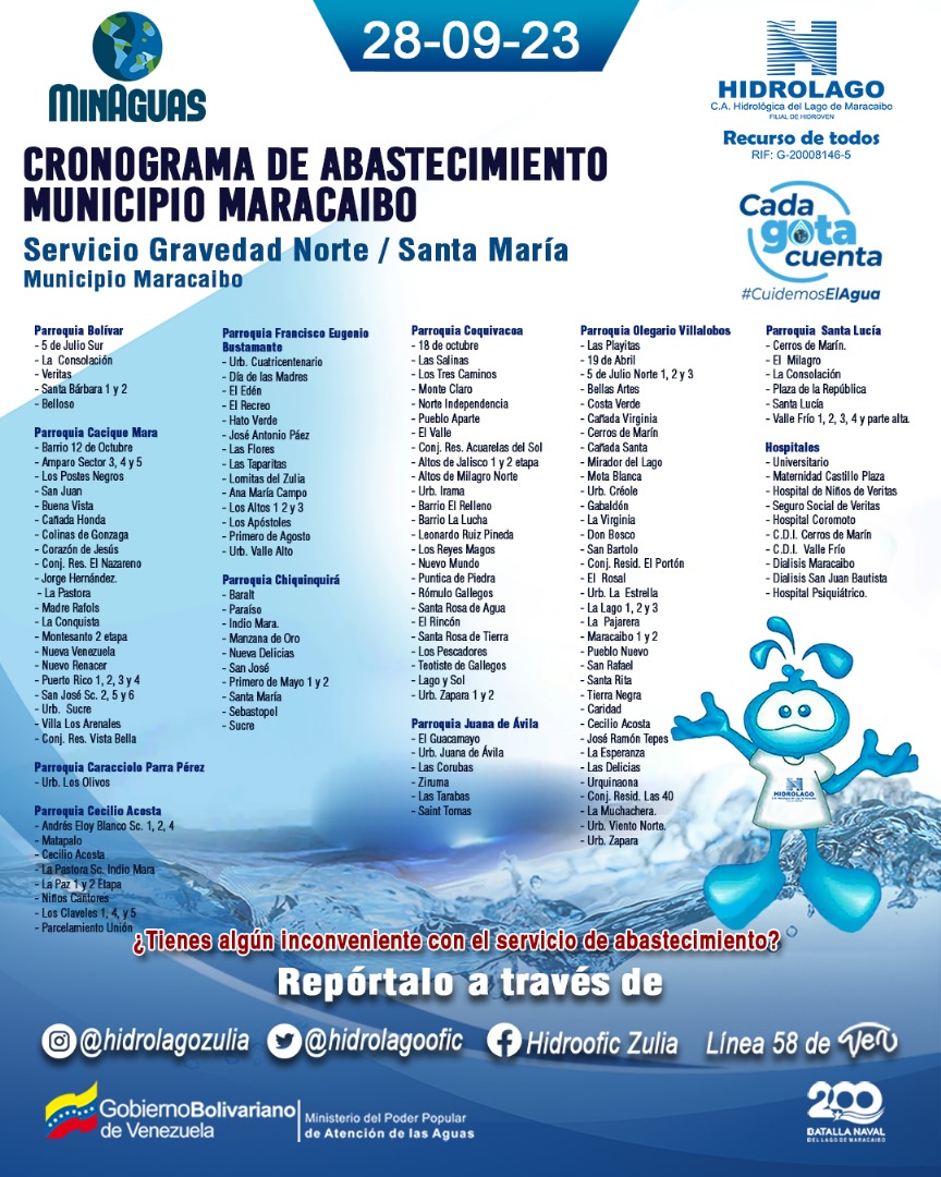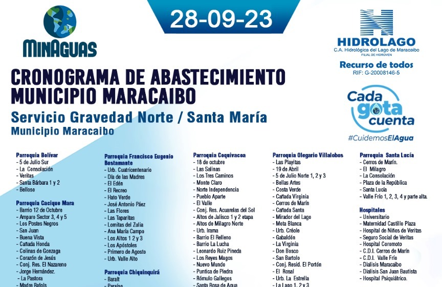 Hidrolago informa a los usuari@s del municipio Maracaibo, que ya se encuentra activo el Servicio Norte Santa María Navegación de entradas Inician recuperación de la Estación de Bombeo Libertad en Lagunillas MinAguas reactiva pozo de agua en sector Palo Blanco, Las Piedras de San Francisco